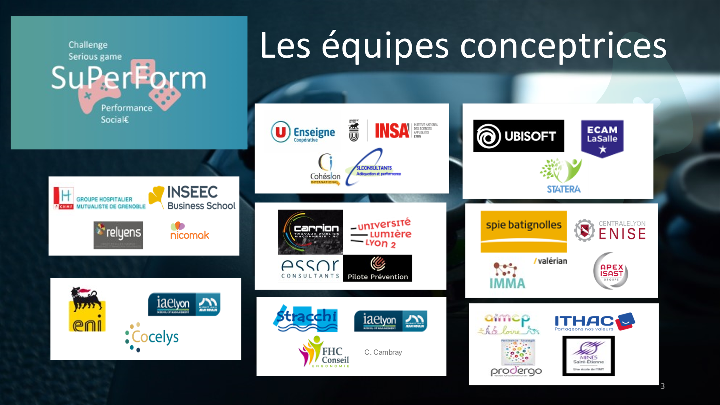 SuPerForm est l'alliance des écoles, entreprises, consultants, institutionnels et partenaires sociaux pour promouvoir la santé, la sécurité, la qualité de vie au travail ainsi que le volet social du développement durable. Les jeux conçus sont libres de droits, adaptables, gratuits, téléchargeables, imprimables. Si l'initiative est régionale, elle vise l'international avec des jeux bilingues français/anglais.