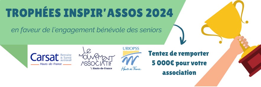 Trophées INSPIR’ASSOS 2024Publié le 15 mai 2025La Carsat Hauts-de-France, en partenariat avec Le Mouvement Associatif des Hauts-de-France et l’Uriopss Hauts-de-France organisent la 1ère édition des « Trophées Inspir’Assos 2024 ». -